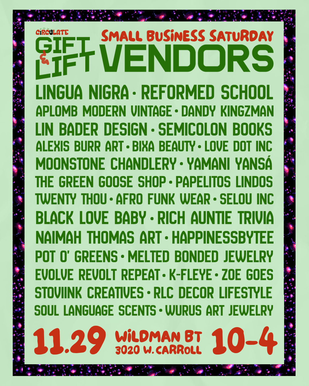 Up Next? CIRCULATE: Gift & Lift - A holiday market on Small Business Saturday. Join us at Wildman BT on Saturday, November 29th from 10am to 4pm, and have an impact on small business owners from all over the city!